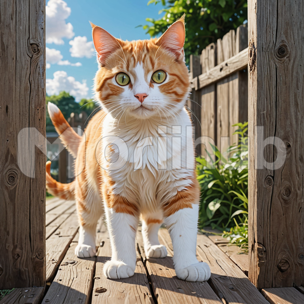 In a whimsical cartoon depiction, a curious cat peeks through a space in a wooden fence with wide eyes and a twitching tail. Its ears perked up with interest, it surveys the world beyond the barrier with a playful sense of wonder. The dappled sunlight filters through the gaps in the fence, casting playful shadows around the feline’s silhouette as it explores the mysteries of the outside world from its cozy vantage point.