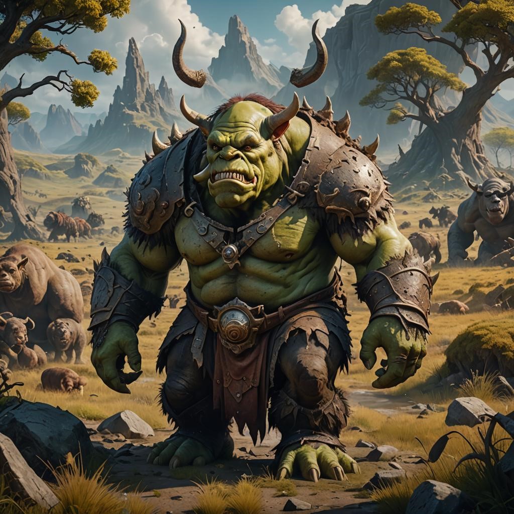 A formidable orc warrior, depicted as a massive, green-skinned figure with a muscular build. The orc is clad in rugged, spiked armor and has large, intimidating horns protruding from its head. The scene is set in a vast, rugged landscape with rocky terrain and scattered trees, suggesting a wild and untamed environment. In the background, other orc-like creatures and animals can be seen, adding to the sense of danger and power that the central figure exudes.