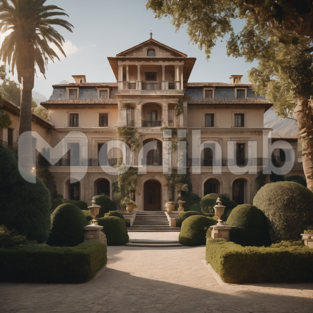 A majestic mansion commands attention, framed by meticulously manicured plants that adorn its exterior. The grandeur of the estate is accentuated against the canvas of a clear, azure sky. Towering columns and architectural splendor stand as testaments to opulence, while the well-tended greenery adds a touch of elegance. The scene unfolds beneath the canvas of an unblemished sky, painting a picture of timeless sophistication and serenity in the heart of architectural splendor.