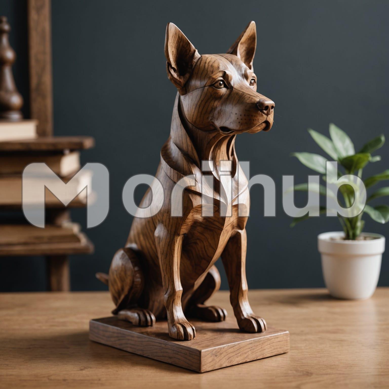 A wooden sculpture of a dog sits proudly on the floor, its intricate carvings capturing the loyal spirit of the canine. The artist has expertly crafted each feature, from the expressive eyes to the textured fur, showcasing a deep understanding of the dog’s form and personality. In the corner, a potted plant adds a touch of greenery to the scene, its leaves gently arching. Together, the sculpture and the plant create a warm, inviting atmosphere, blending artistry with nature and bringing life to the space.