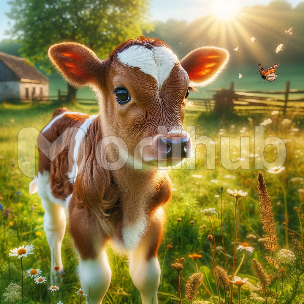 In the tranquil embrace of a countryside haven, a cute baby cow, affectionately known as a calf, embodies pure innocence. Its diminutive frame is wrapped in a soft, velvety brown and white coat that begs to be touched. With big, soulful eyes, it gazes upon the world with an expressive wonder, capturing the essence of untamed beauty and serenity in the heart of nature.