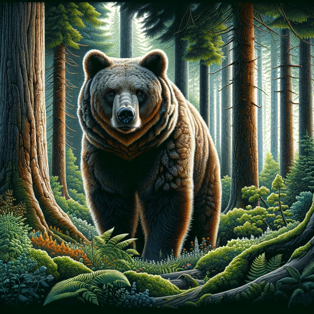 In the heart of a lush forest, a majestic scene unfolds. Towering amidst the verdant greenery stands a wild bear, its imposing figure exuding an aura of primal strength. Its thick, shaggy brown fur gleams in dappled sunlight filtering through the canopy, each strand catching the light in a mesmerizing dance. With a powerful stance, the bear surveys its domain, a symbol of untamed wilderness amidst the tranquil beauty of the forest.