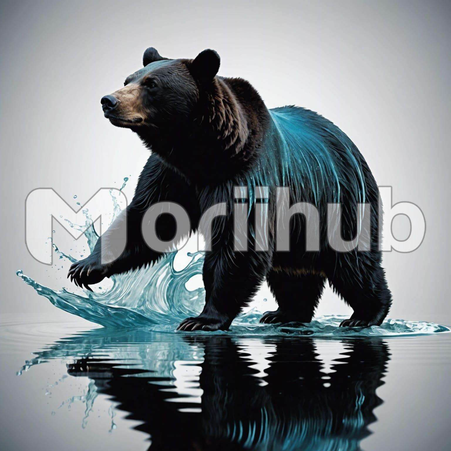 In a vivid artwork, a bear defies gravity, strolling gracefully atop rippling waters. Its reflection, a mirror image, dances below, creating a mesmerizing symmetry. Against a plain background, devoid of distraction, the scene’s focal point—the bear and its watery pathway—commands attention. Each brushstroke captures the bear’s strength and fluidity, evoking a sense of wonder and awe. The contrast between the serene surface and the bear’s confident stride imbues the piece with a captivating energy, inviting viewers into a world where impossibilities become reality.