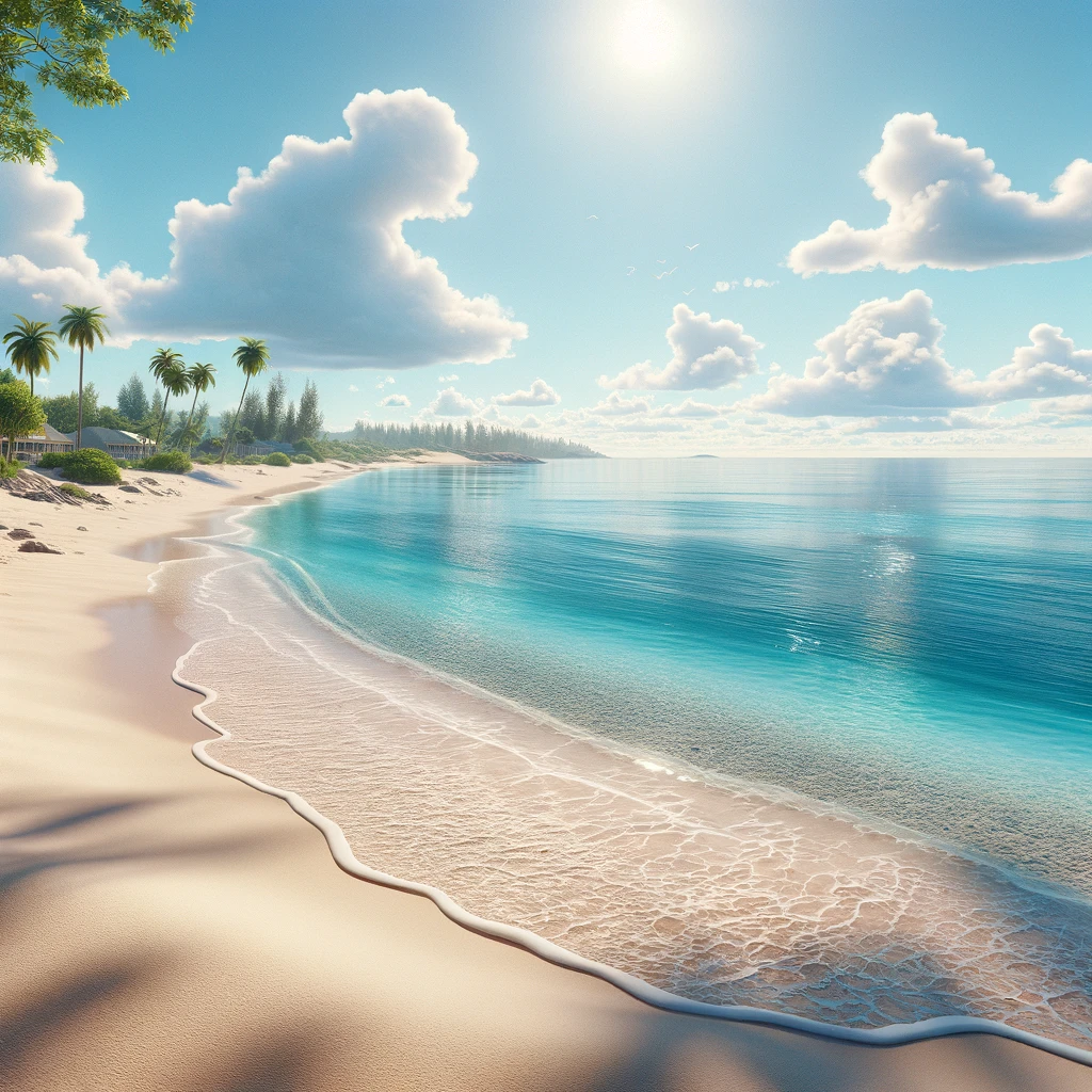 In this serene and beautiful beach scene, tranquility reigns supreme as a wide expanse of soft, white sand stretches along the shore. The gentle lull of the waves creates a peaceful rhythm, inviting contemplation and relaxation. With the sun painting the sky in pastel hues, it’s a scene of pure serenity and natural beauty.
