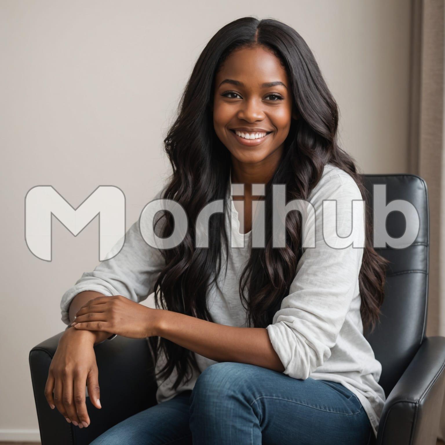 A stunning ebony woman sits gracefully, her radiant smile illuminating the room. Her smooth, dark skin contrasts elegantly with the surroundings, highlighting her natural beauty. She exudes confidence and warmth, her eyes sparkling with joy. Dressed impeccably, she embodies grace and sophistication in every gesture. The ambiance around her seems to brighten with her smile, creating an aura of positivity and charm. This captivating scene captures a moment of pure happiness and inner beauty, where her presence fills the space with grace and radiant energy.