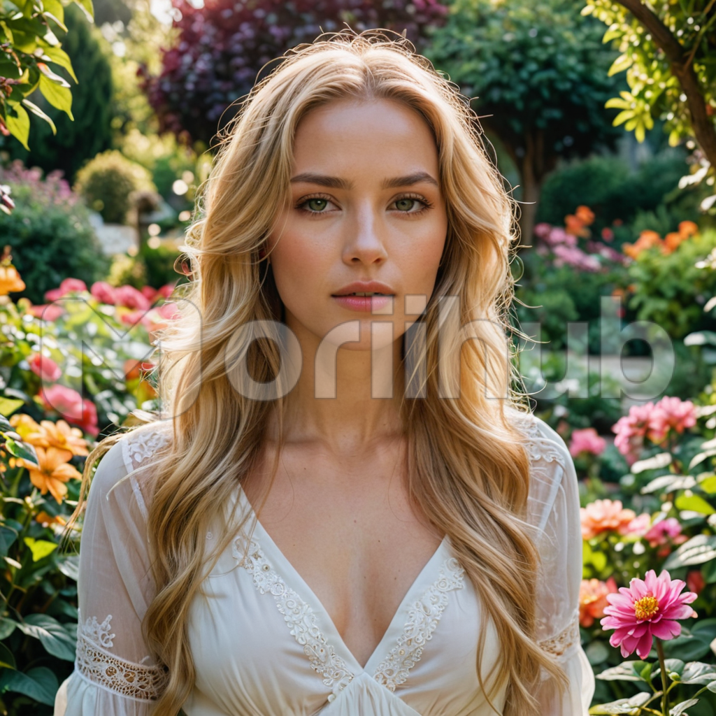 In the garden’s embrace, a beautiful woman stands, a vision of grace and elegance amidst nature’s splendor. Her presence infuses the air with a sense of tranquility and serenity, as if the flowers themselves bow in homage to her radiance. Amidst the blooming flowers and verdant greenery, she embodies the harmony and beauty of the natural world, a living embodiment of the garden’s enchanting charm.
