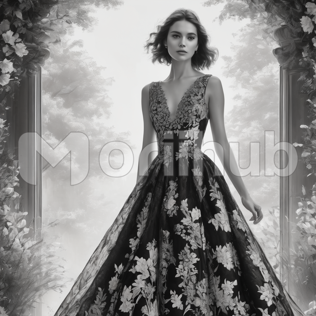 Adorned in a floral-designed gown, a woman stands with timeless grace, her gaze directed toward an unseen horizon. The gown’s petals create a vibrant symphony, harmonizing with her short hair. Every detail captures the essence of a blooming garden, and her poised stance exudes an air of quiet strength. In this enchanting scene, floral elegance intertwines with the woman’s poised presence, creating a portrait where nature’s beauty and human grace become one.
