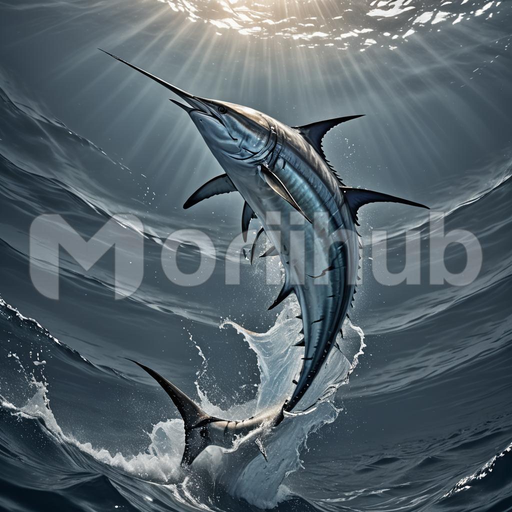 A Blue Marlin swims gracefully through the ocean, its sleek body cutting through the water with ease. The vibrant blue and silver scales shimmer under the sunlight, showcasing the fish’s power and elegance.