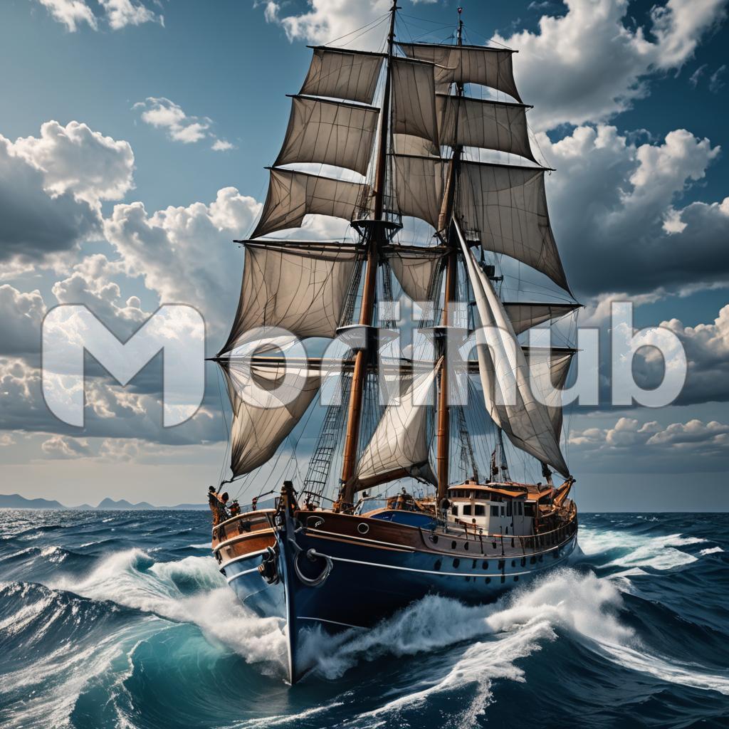 A modern ship glides gracefully across the deep blue sea, its sleek lines cutting through gentle waves with efficiency. The polished hull reflects the sunlight, contrasting vividly against the azure water. Onboard, passengers enjoy panoramic views from glass-walled lounges, while crew members navigate with advanced technology. This scene epitomizes the blend of luxury, technology, and natural beauty that defines contemporary maritime travel.