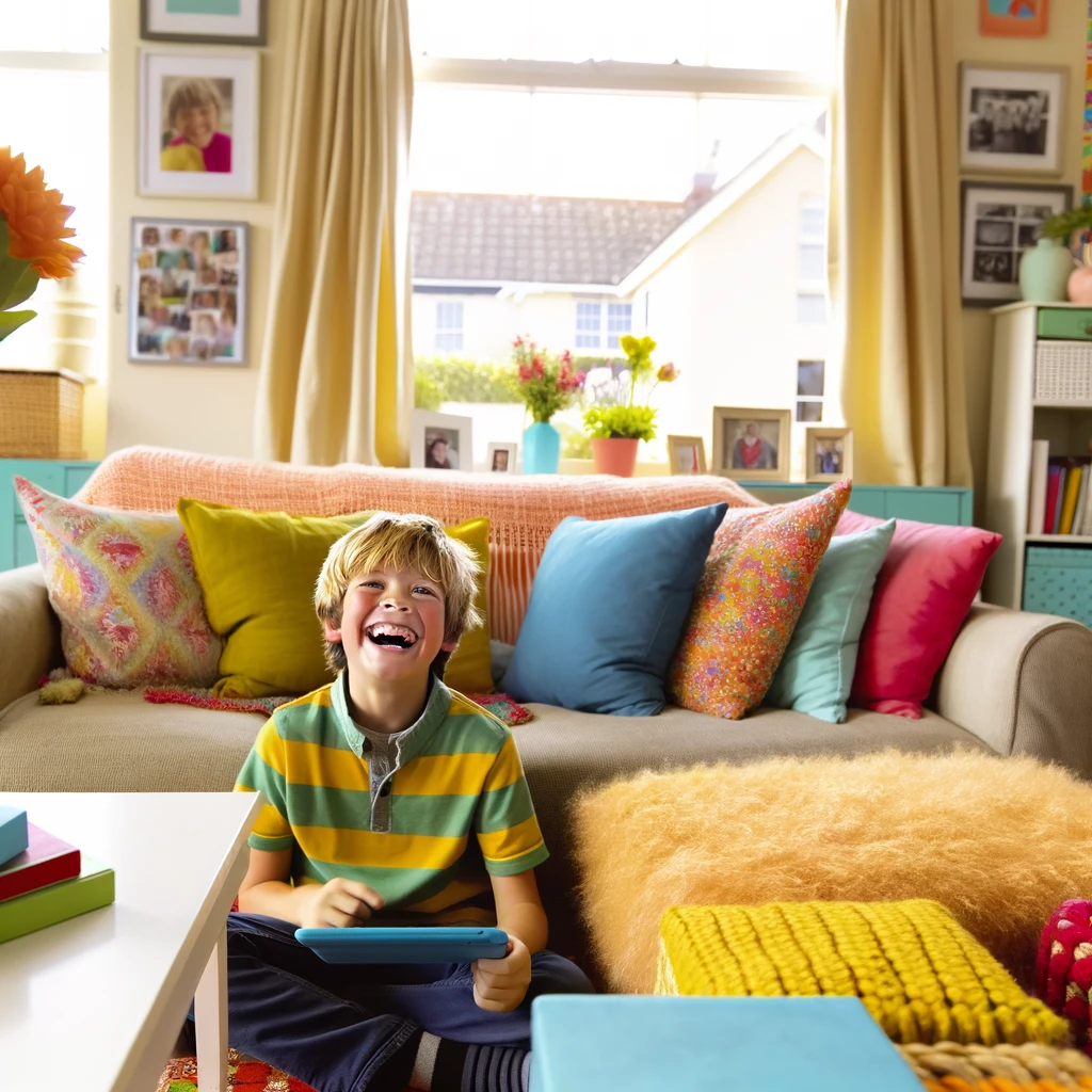 In a brightly lit sitting room adorned with colorful and comfortable furnishings, a cheerful boy sits on a soft, inviting sofa. His eyes sparkle with delight as he engages with the vibrant surroundings. Surrounded by plush pillows and playful decor, he exudes pure happiness, basking in the warmth of his cheerful sanctuary.