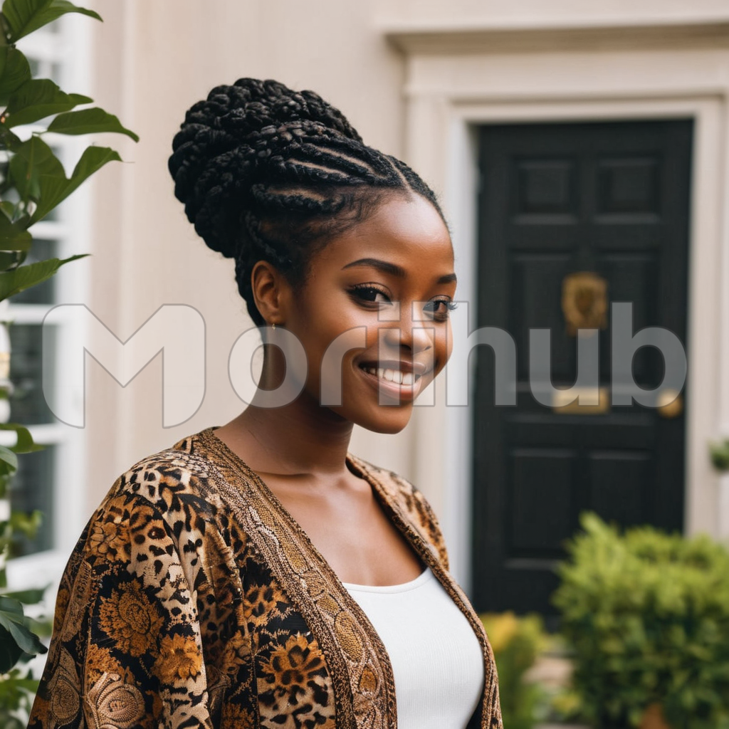 A radiant black woman beams with a captivating smile, her hair intricately braided and elegantly tied in a bun. The joyful expression illuminates her features, radiating warmth and confidence. Behind her, a door of a house stands as a symbol of welcome and comfort, framing the portrait of a woman whose beauty resonates with inner strength and happiness, inviting others into the sanctuary of her joyous presence.