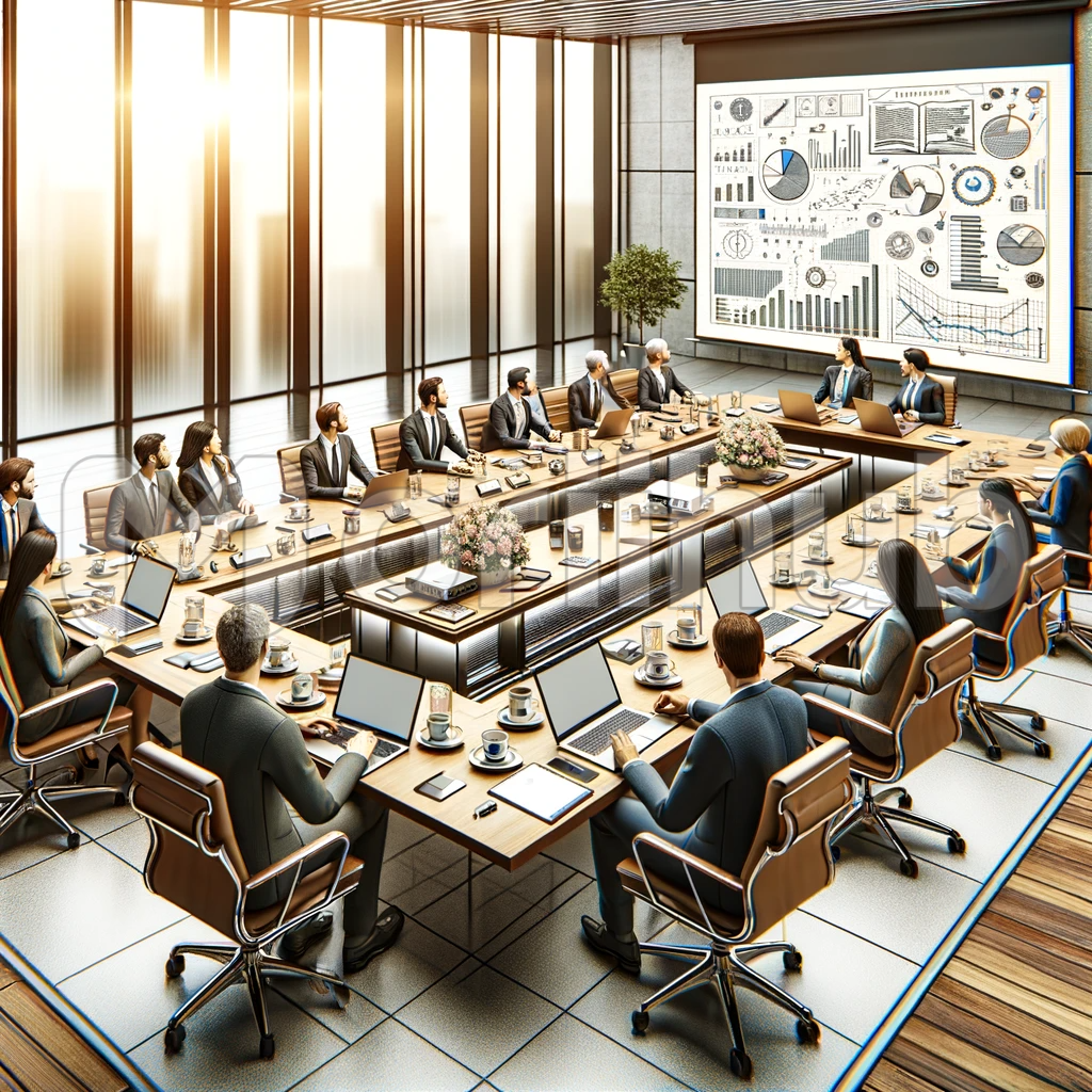 In the bustling conference meeting, a spacious table sits at the center, enveloped by professionals donned in sharp business attire. Laptops hum with activity, their screens displaying data and ideas, while notepads brim with scribbled notes. Conversations flow, punctuated by gestures and nods, as this assembly of dedicated minds collaborates to shape the future.
