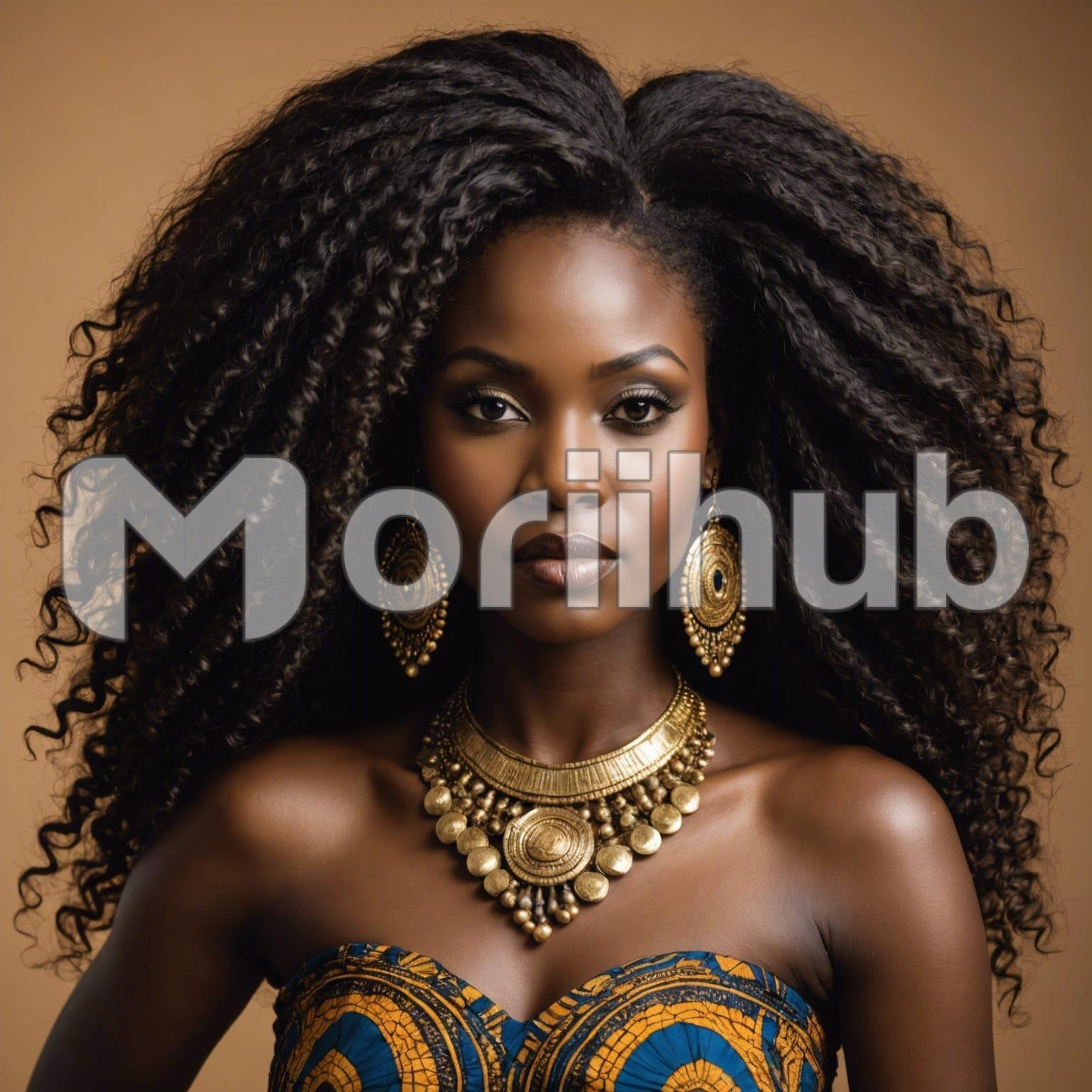 A stunning African woman stands poised, her eyes looking thoughtfully into the distance. Her lustrous hair, rich and glossy, frames her face beautifully. She wears an exquisite neckpiece and matching earrings, their intricate designs enhancing her natural elegance. Set against a plain background, her striking features and regal bearing stand out. Her smooth, radiant skin glows, and her expression is one of serene confidence. The simplicity of the backdrop accentuates her grace and beauty, making her presence powerfully captivating and unforgettable.