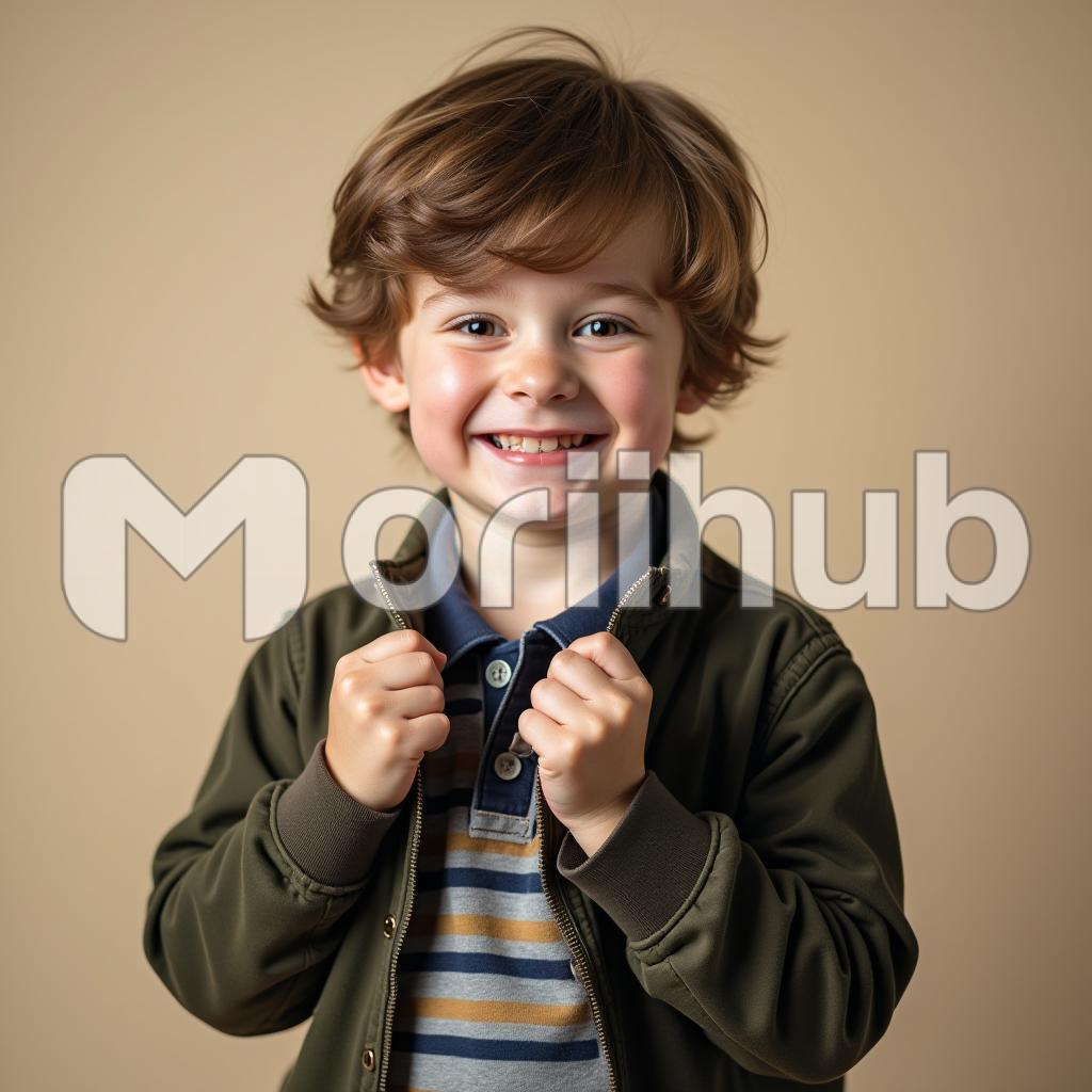 A cute little boy beams with joy, his infectious smile lighting up his cherubic face. His bright eyes sparkle with mischief and innocence, reflecting a world of curiosity and wonder. Clad simply, he exudes a sense of playfulness that is truly endearing. His tousled hair adds to his charm, framing his face perfectly. Against a plain background, the focus is entirely on his delightful expression, capturing a moment of pure happiness. This portrait of childhood innocence invites smiles and warmth from anyone who beholds it.