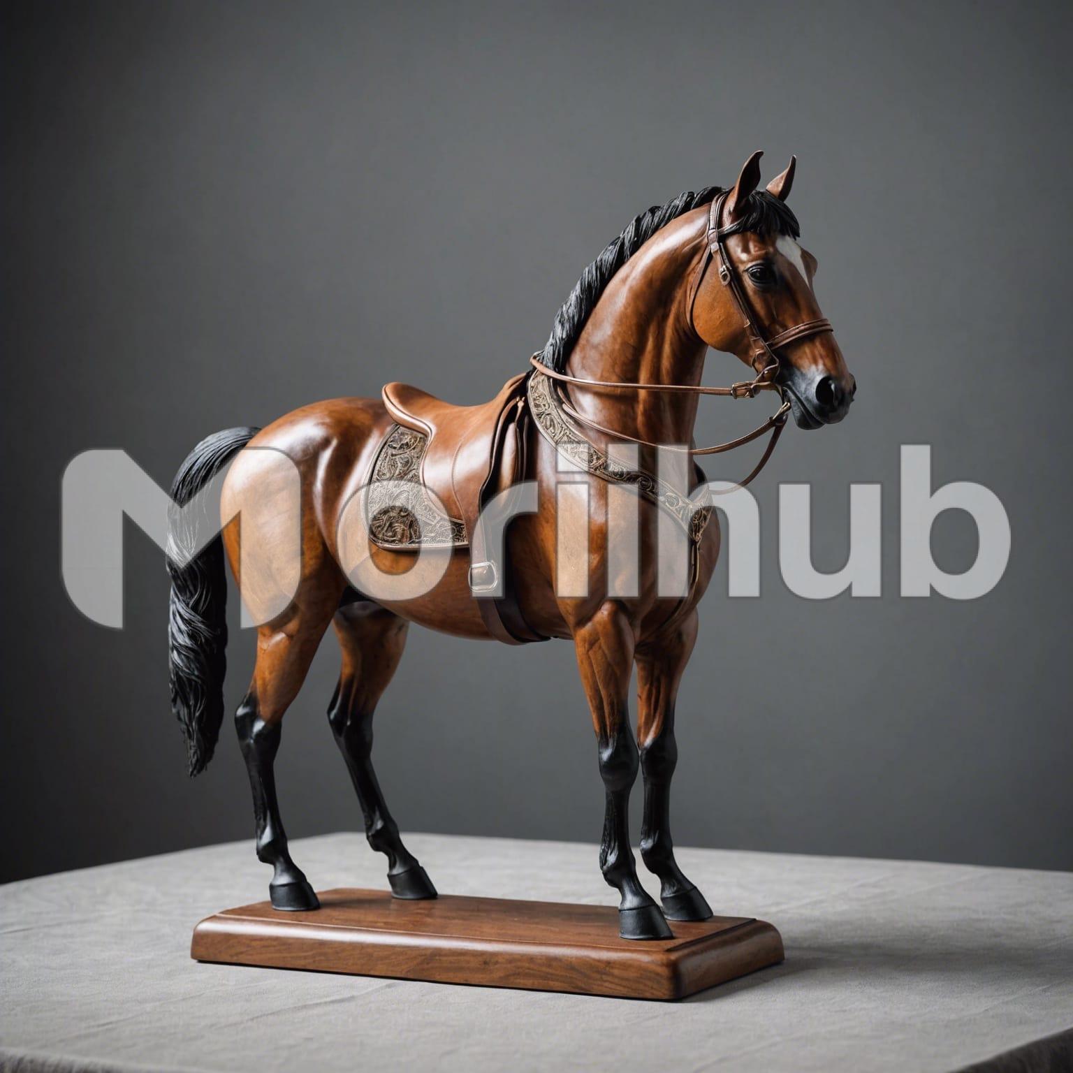 Perched elegantly on a tabletop, the crafted wooden horse exudes timeless charm and exquisite craftsmanship. Its smooth, polished surface highlights the rich grain of the wood, while intricate carvings detail the mane, tail, and musculature, capturing the essence of grace and strength. The horse stands poised, mid-gallop, as if ready to spring to life. The natural warmth of the wood adds a touch of rustic beauty to its surroundings, making this piece not just a decoration, but a testament to artisanal skill and creativity.
