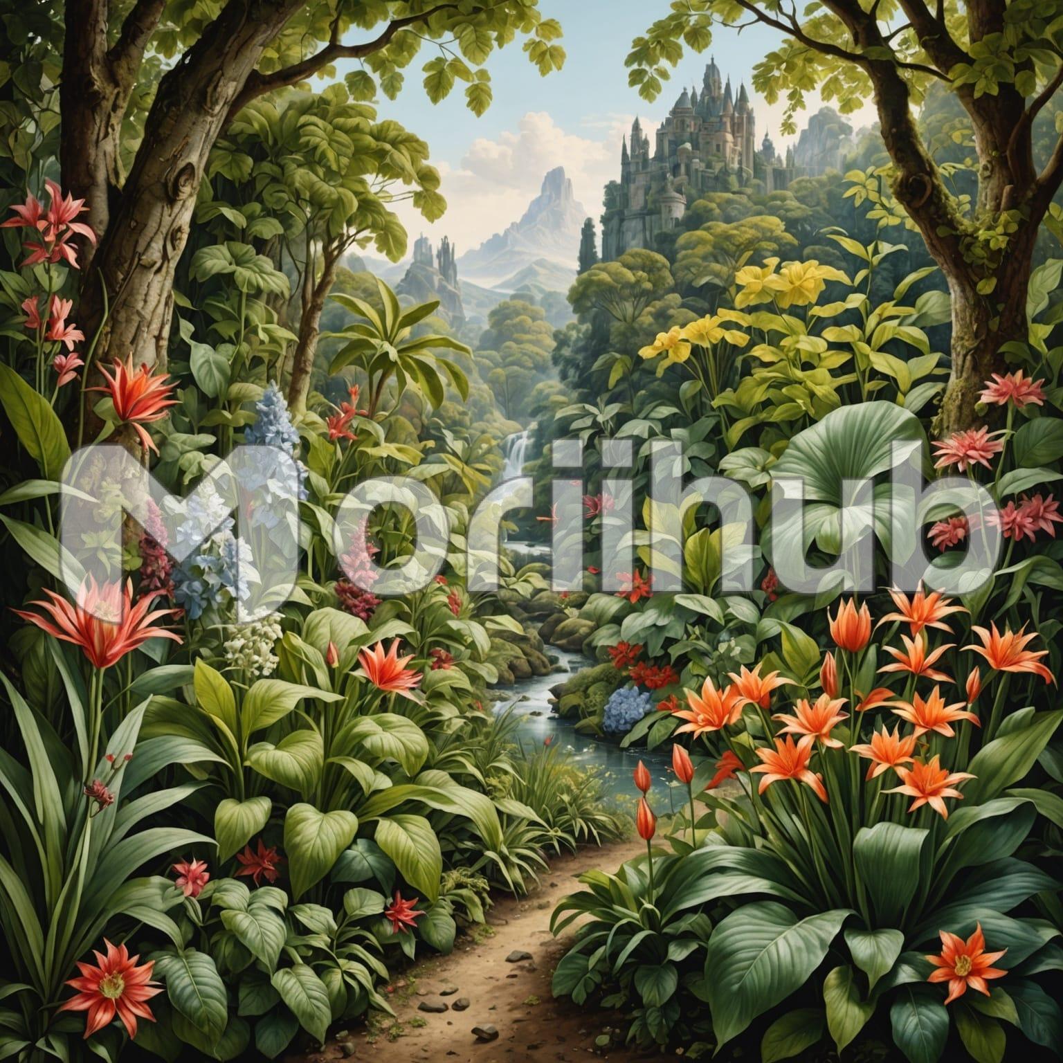 Lush greenery blankets the landscape, a vibrant tapestry of foliage and trees that stretches as far as the eye can see. Amidst this verdant expanse stands a majestic castle, its turrets and battlements rising proudly against the sky. The castle, weathered by time yet still imposing, evokes a sense of history and grandeur. Its silhouette against the horizon adds a touch of mystique to the scene, hinting at tales of knights and royalty from centuries past. The juxtaposition of nature’s bounty and human craftsmanship creates a captivating tableau of beauty and heritage.