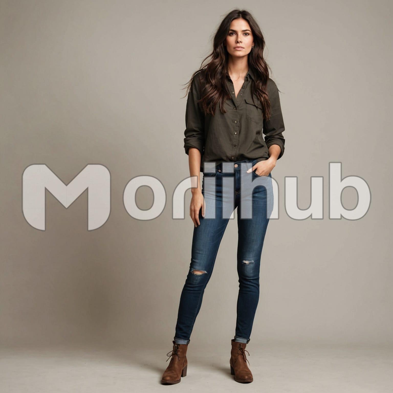 A woman stands confidently against a plain background, her posture relaxed yet poised. Her sleeves are neatly folded, giving her outfit a tailored look. One hand is casually tucked into her pocket, adding a touch of nonchalance to her stance. Her other arm rests naturally at her side, complementing her effortless demeanor. The simplicity of the plain background highlights her presence, emphasizing the clean lines of her attire and the subtle elegance of her composed posture. The overall effect is one of understated sophistication.