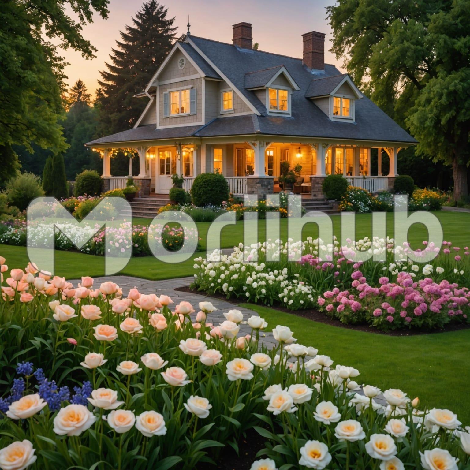 A charming house stands quietly in the evening, exuding warmth and character as soft lights illuminate its windows. The gentle glow spills onto the front porch, inviting and cozy. In the well-kept lawn, vibrant flowers bloom, their colors vivid against the deepening twilight. The fragrant blossoms sway gently in the evening breeze, enhancing the scene’s tranquility. The house, with its inviting façade, is surrounded by the beauty of nature, creating a picturesque setting. This serene atmosphere evokes feelings of comfort and home, a perfect retreat as day transitions into night.