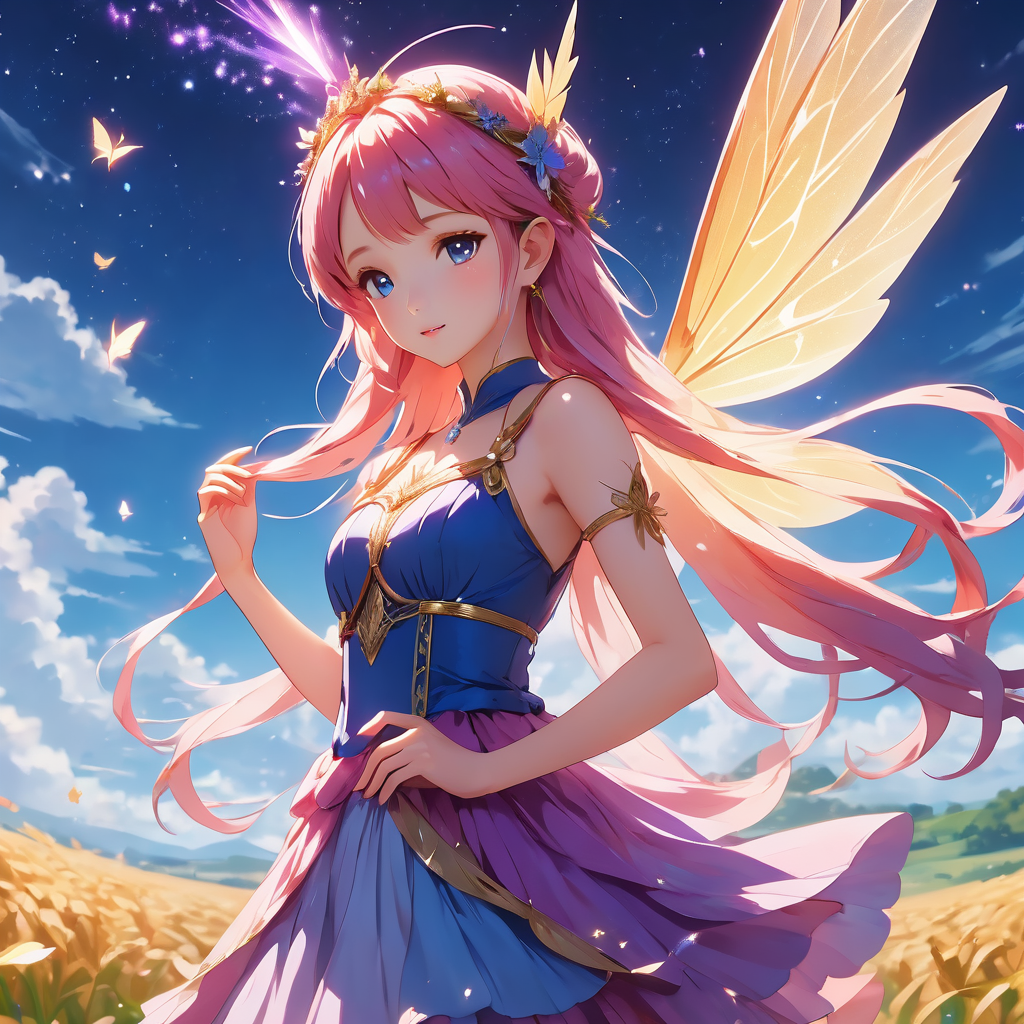 In a whimsical depiction, an enchanted fairy lady graces the scene with her ethereal presence. Delicate, translucent wings flutter gracefully behind her as she moves, emanating an aura of magic and wonder. Her luminous, iridescent attire shimmers in the soft glow of fairy light, accentuating her enchanting beauty. With a mischievous twinkle in her eyes and a playful smile on her lips, she captivates all who behold her enchanting charm.