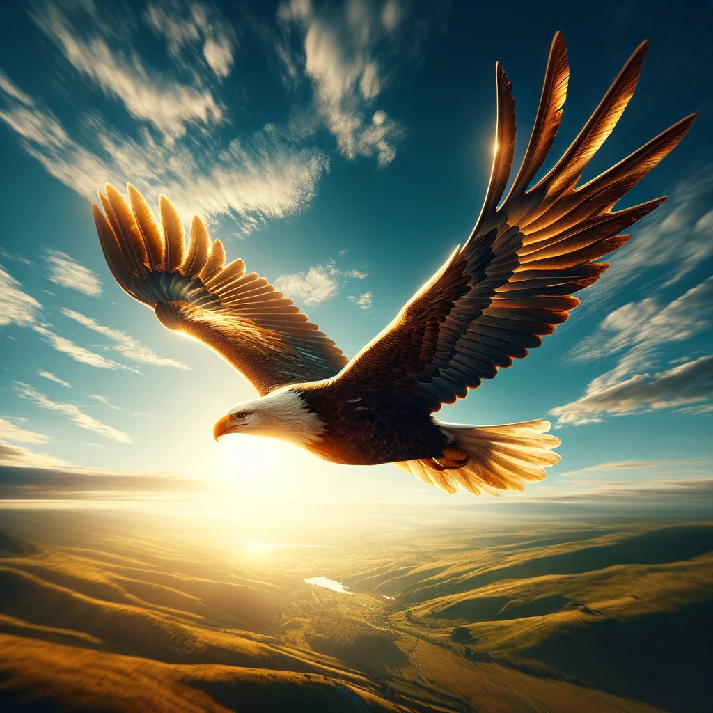 An eagle soars majestically through a clear blue sky, its wings spread wide in a graceful arc as it glides effortlessly on the thermals. The sun shines brightly, casting a warm, golden glow upon the magnificent bird, highlighting the intricate patterns of its feathers as it navigates the boundless expanse with freedom and precision.