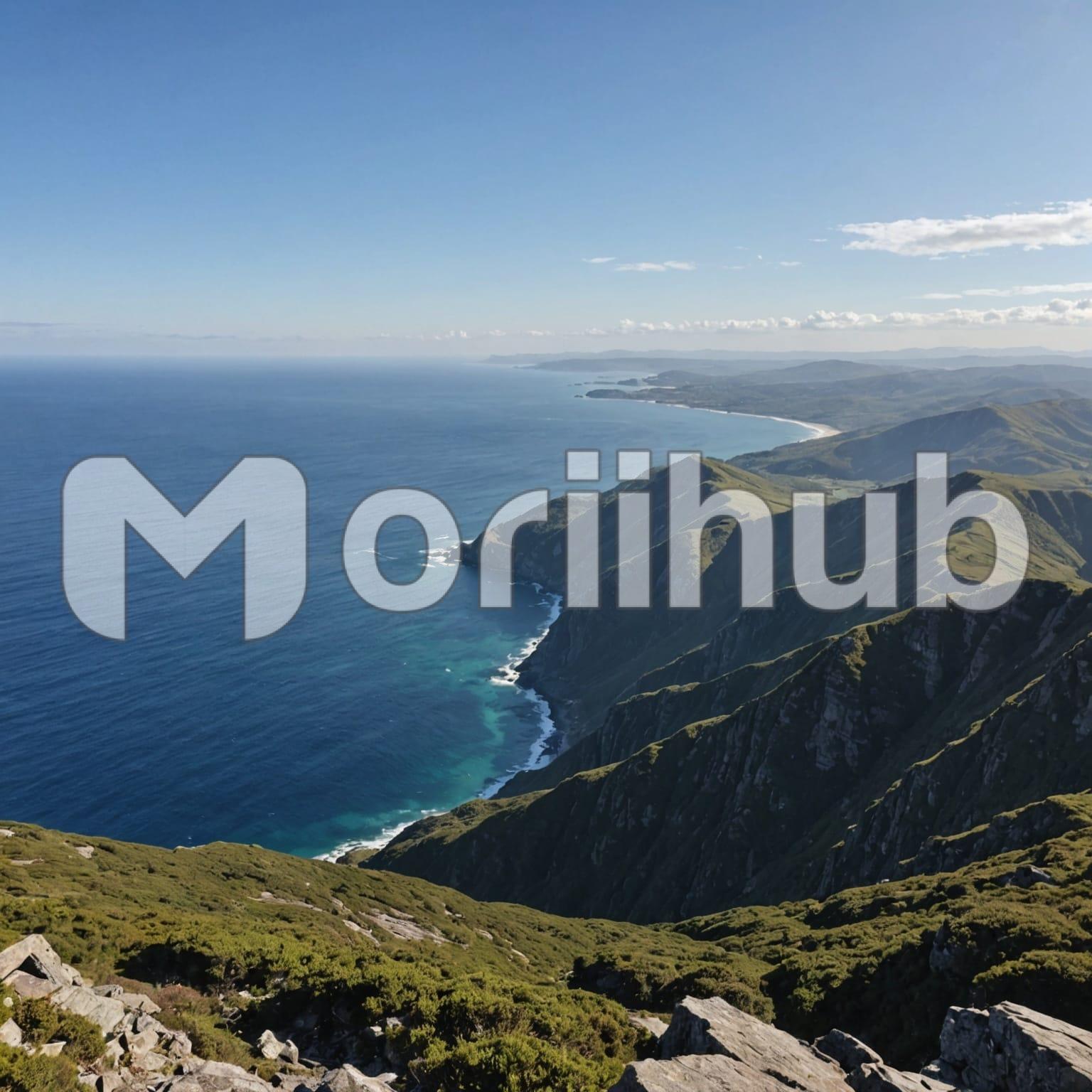 From atop the mountain, a vast view of the ocean unfolds below, stretching endlessly to the horizon beneath a clear sky. The deep blue waters shimmer, creating a mesmerizing contrast against the rocky cliff edges. Gentle waves ripple across the surface, adding texture to the vast expanse. The height offers a unique vantage point, making the ocean seem even more expansive and mysterious. A cool breeze drifts up from the coast, carrying the fresh, salty scent of the sea. This serene scene captures nature’s grandeur, blending ocean, mountain, and sky in perfect harmony.