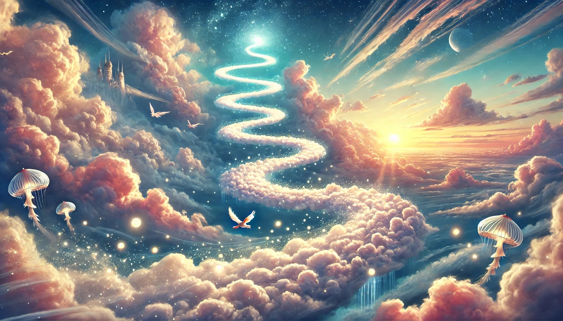 A magical cloud path winds through the sky, leading to a distant, enchanted destination. The path is made of fluffy, white clouds that shimmer with a soft, ethereal glow. It twists and turns gracefully, creating a whimsical, dreamlike trail through the heavens. Along the edges of the path, small, glowing orbs of light float, illuminating the way.