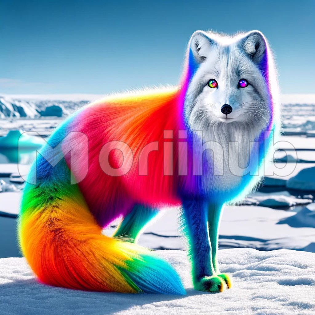 Picture a surreal and captivating Arctic landscape where an enchanting fantasy Arctic fox reigns supreme. Its coat, instead of the customary white, is a mesmerizing kaleidoscope of vibrant, otherworldly colors that defy nature’s norms. This majestic creature stands gracefully upon a pristine snowy expanse, its brilliant fur contrasting beautifully with the icy surroundings, creating a dreamlike tableau of wonder and imagination.