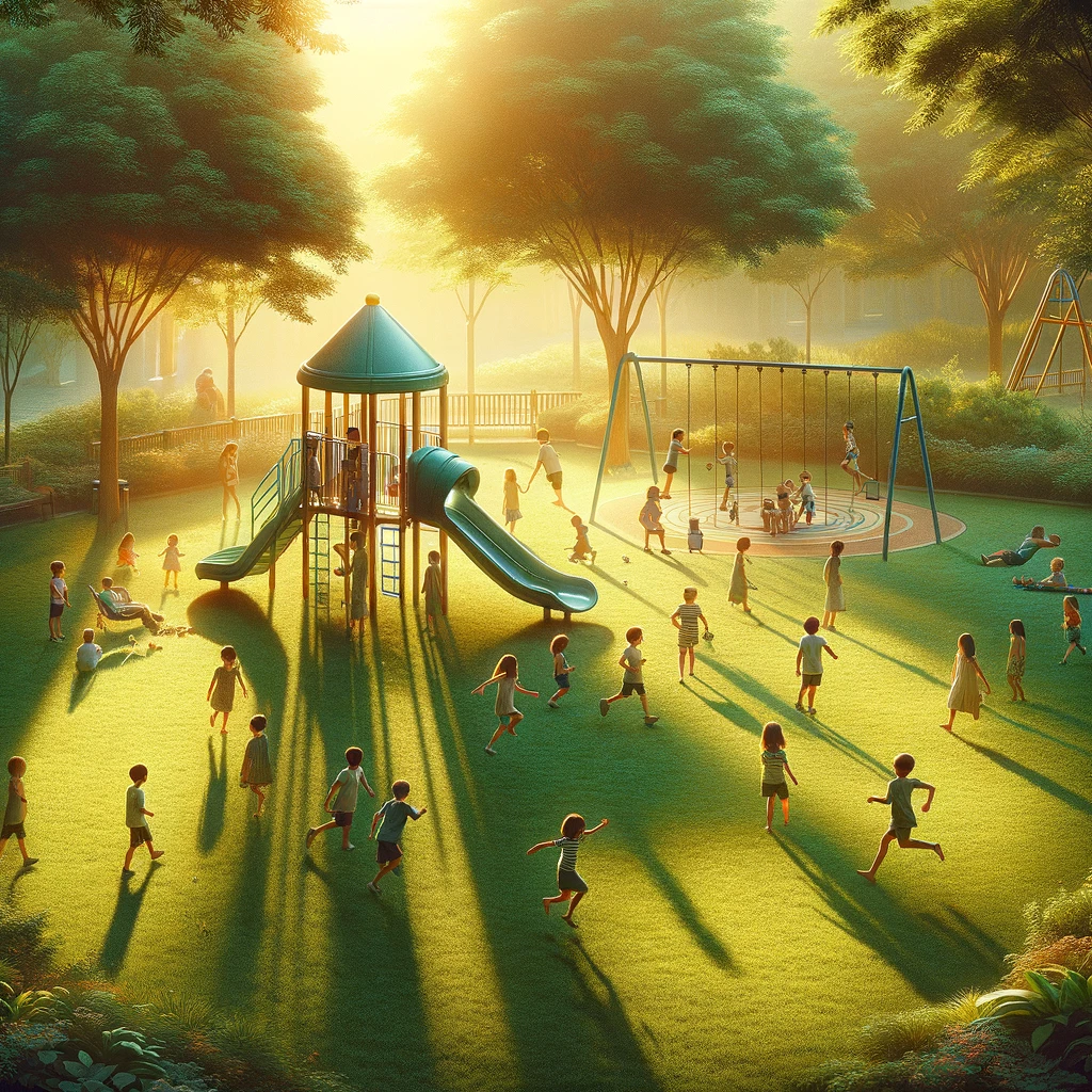 In the heart of the verdant park, laughter dances in the air as children chase each other around the playground. The vibrant scene is adorned with colorful swings soaring high, a gleaming slide inviting endless giggles, and a merry-go-round spinning with pure delight. Amidst the lush greenery, innocence blossoms in every smile.