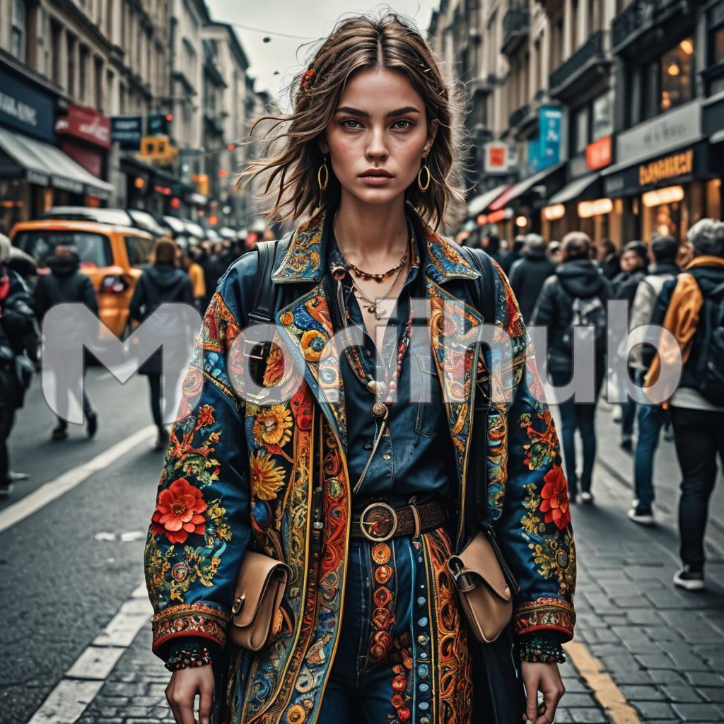 The model strikes a confident pose on the street, effortlessly commanding attention amidst the urban backdrop. Dressed in a stylish outfit that blends high fashion with streetwear flair, they exude a sense of poise and self-assurance. The city streets, with their dynamic energy and vibrant graffiti or sleek modern buildings, provide a striking contrast to the model’s composed presence. They stand with one hand casually resting in a pocket or adjusting their sunglasses, while their gaze captures the essence of cool detachment. The play of light and shadow across their outfit highlights the textures and details, making the ensemble pop against the cityscape. Passersby and the hustle of city life create a dynamic, ever-changing environment, adding to the allure and context of the shot. This moment encapsulates the intersection of fashion and urban culture, showcasing the model’s ability to blend seamlessly into the rhythm of the street while standing out as a focal point.