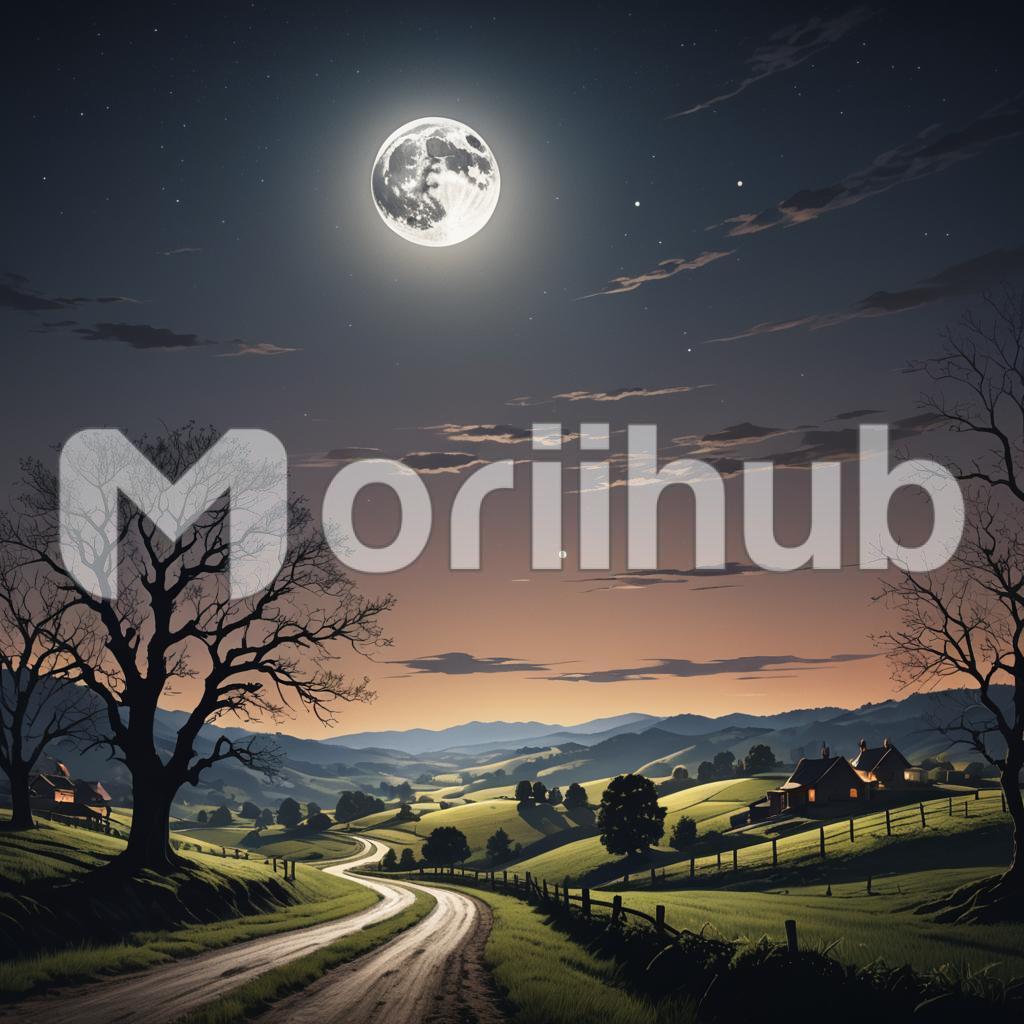 The moon, positioned prominently in the night sky, casts a soft, silvery light that contrasts with the dark silhouettes of the rural landscape. The farmland features a darkened barn, a windmill, and neatly spaced rows of crops, all outlined against the moonlit sky. Silhouetted trees with sprawling branches add a touch of mystery and depth to the scene. The moon’s serene light creates a peaceful, almost ethereal atmosphere, highlighting the simplicity and beauty of the rural life, and inviting viewers to experience a quiet, reflective moment under the vast, open sky.