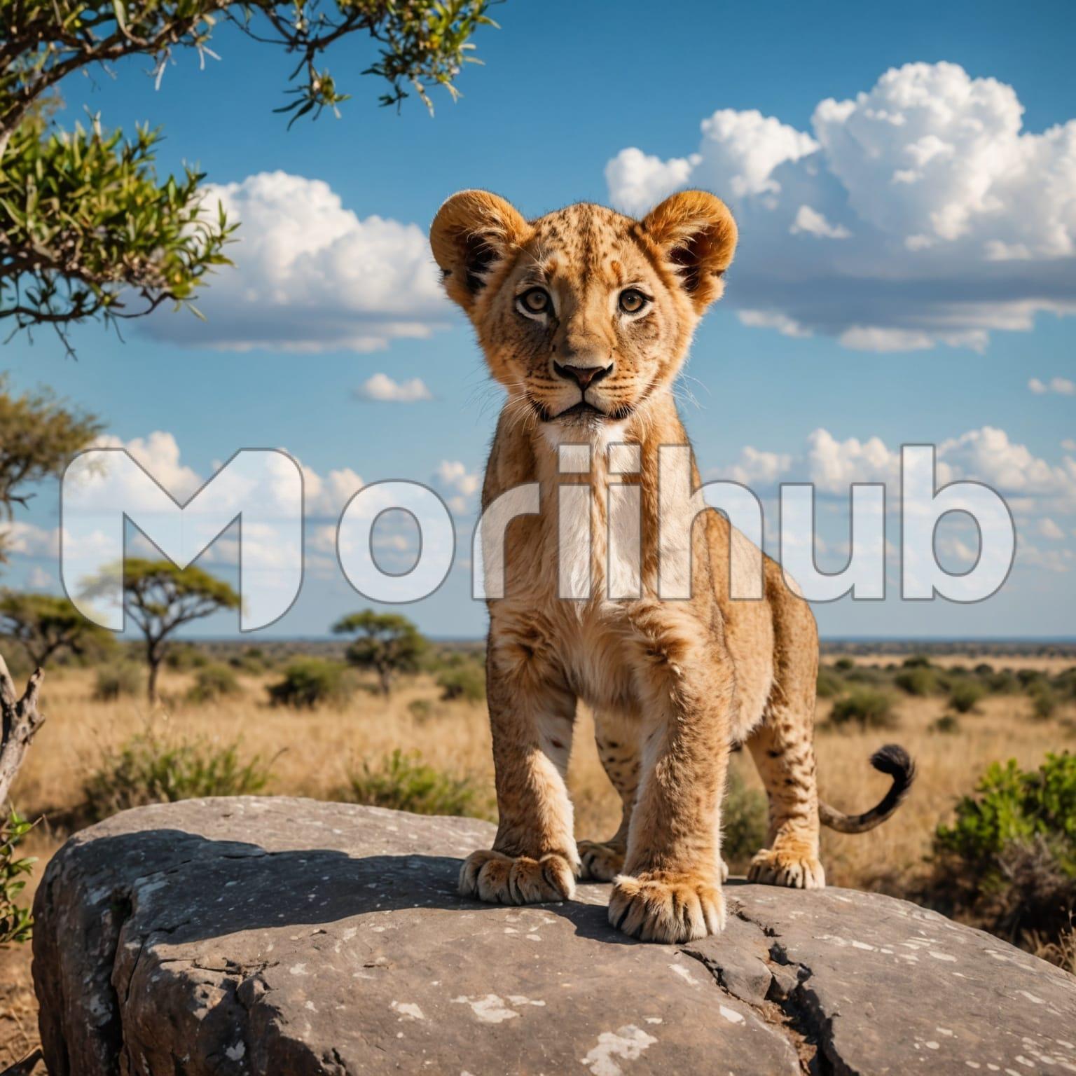 A lion cub stands proudly atop a weathered boulder in the savannah, its youthful mane tousled by the wind. It surveys its domain with wide, curious eyes, the rolling grasslands stretching out around it. Wisps of clouds drift lazily across the expansive sky, their soft shapes contrasting with the cub’s sturdy stance. In the distance, acacia trees stand sentinel against the horizon, completing the serene tableau of wild Africa where the cub embodies both innocence and the promise of future strength.