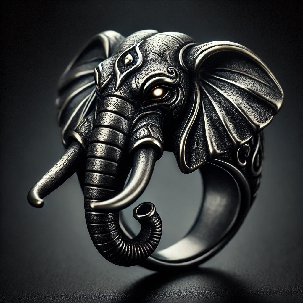 The ring is designed in the form of a majestic elephant, with its head prominently featured. The elephant’s trunk elegantly wraps around the band, while its large ears frame the design. The dark, shadowy metal adds a sense of mystery and ancient power, with intricate details etched into the elephant’s features. Its eyes glow softly, casting an eerie yet calm light, enhancing the ring’s mystical aura.
