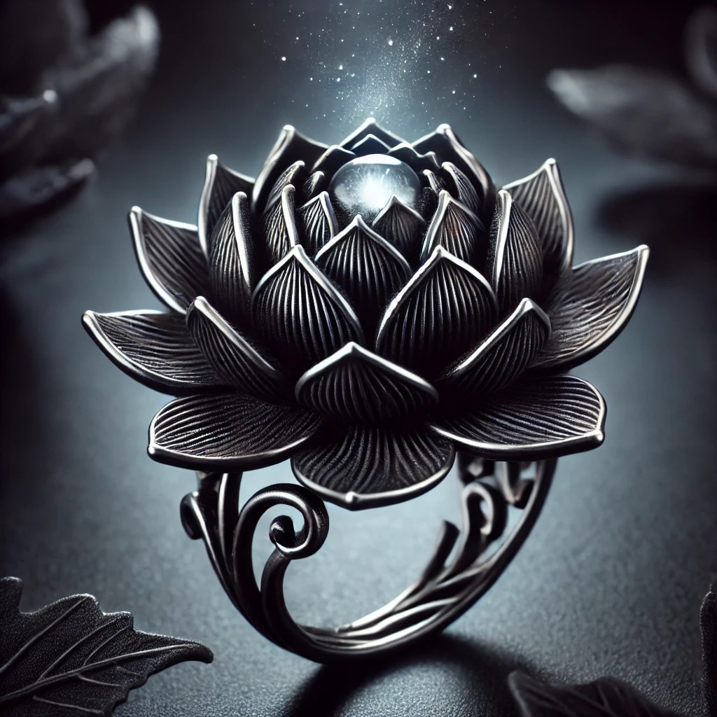 The ring is designed in the shape of a lotus flower, with intricately layered petals crafted from dark, shadowy metal. Each petal is finely detailed, creating a sense of elegance and mystery. The center of the lotus emits a soft, mystical glow, enhancing the ring’s magical aura. The band is adorned with subtle vine patterns that add to the ring’s enchanted, natural feel.