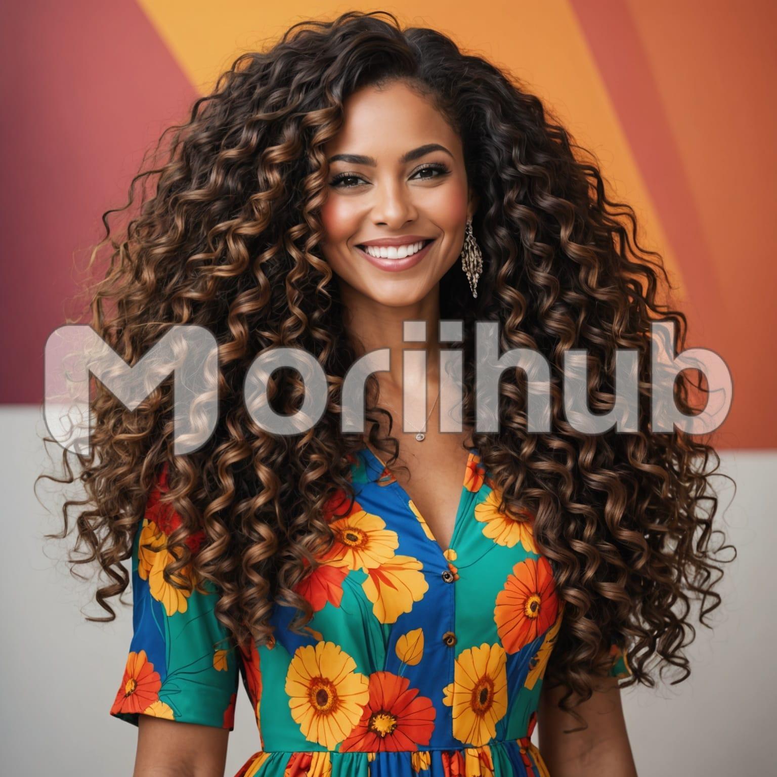 A woman beams with a radiant smile, her eyes sparkling with joy. She wears a vibrant, colorful gown that flows gracefully, its rich hues creating a mesmerizing pattern. Her lustrous hair cascades in soft, glossy waves, catching the light and adding to her lively presence. The gown’s vivid colors complement her cheerful demeanor, while her radiant smile exudes warmth and confidence. The overall effect is both captivating and uplifting, as if her joyful spirit brings the entire scene to life.