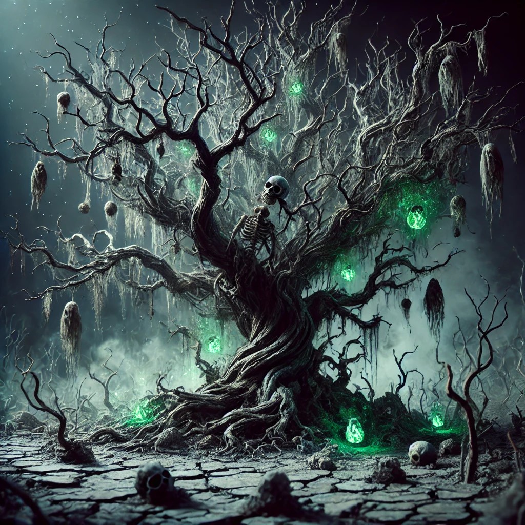 A haunting death bush with twisted, blackened branches that drain life from the environment.
