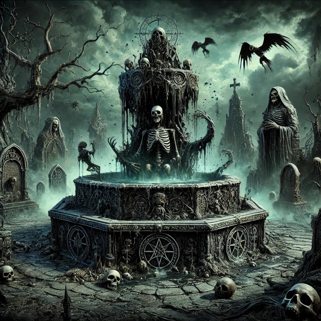A haunting death fountain, crafted from dark, decayed stone and twisted metal. Thick, black liquid or mist flows ominously from the fountain, symbolizing death and decay. The surface of the fountain is adorned with skeletal carvings, bones, and faintly glowing runes in a sickly light. The surrounding landscape is barren, with withered plants, dead trees, and crumbling statues adding to the eerie atmosphere.