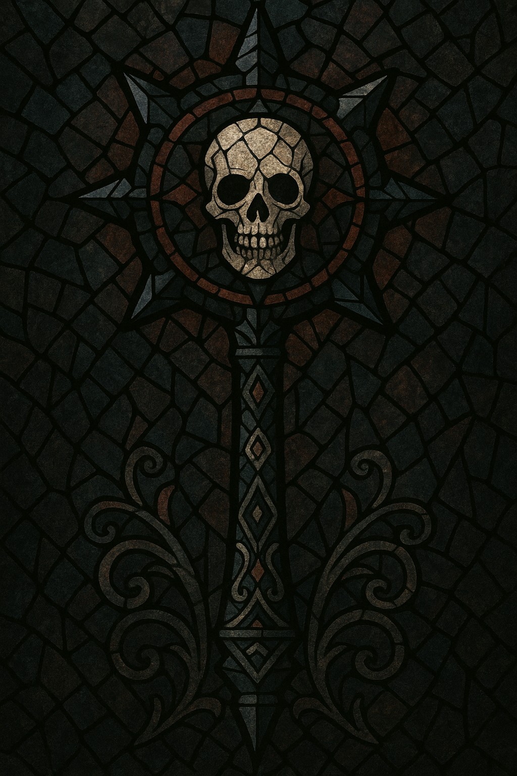 This digital abstract mosaic depicts a hauntingly symbolic mace, rendered in a stained-glass style with ornamental precision. Dominated by deep tones of black, crimson, and shadowy gray, the composition centers on a skeletal motif—an eerie skull embedded in the mace’s head, evoking death and decay. Jagged spikes radiate outward, framed by sharp, angular glass fragments that shimmer subtly with muted highlights.