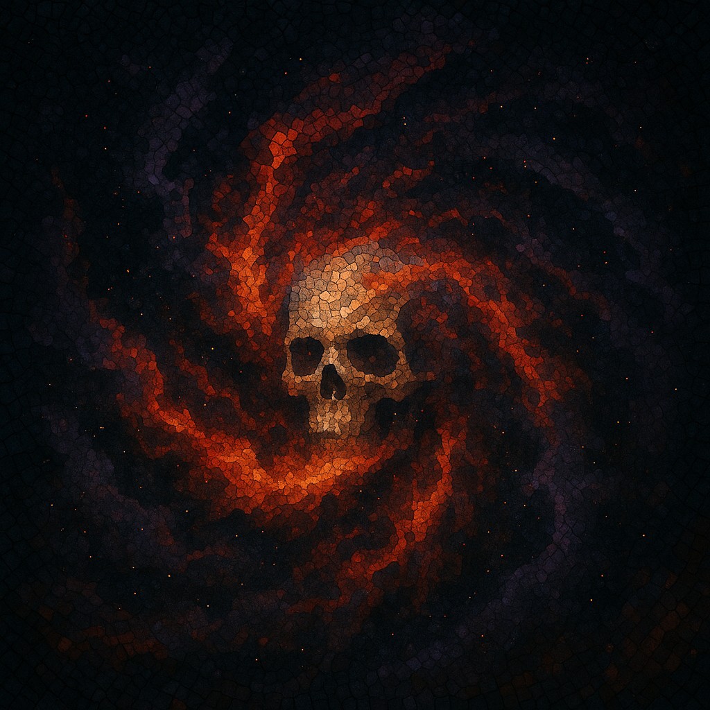 The image is a digital abstract mosaic styled as a cosmic nebula, infused with the symbolic element of death. At the center, a skull emerges subtly but prominently, constructed from lighter mosaic tiles that contrast sharply with the surrounding vibrant colors. The nebula itself is formed from swirling patterns of red, orange, yellow, purple, gray, and black, arranged in irregular, glass-like tiles reminiscent of stained glass.