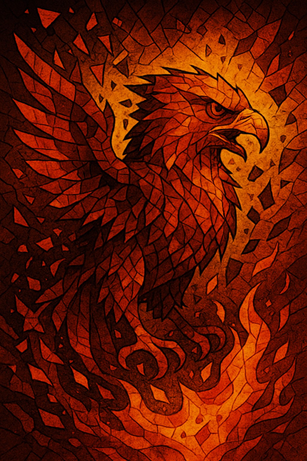 This digital abstract mosaic features a fierce eagle formed from shards of vibrant, angular tiles in fiery shades of red, orange, and deep amber. The eagle’s eyes burn with intensity, its beak sharp and commanding, while its wings stretch outward, dissolving into chaotic, jagged fragments as if tearing through reality itself. Flames and shattered glass-like pieces erupt around its form, symbolizing destruction and rebirth.