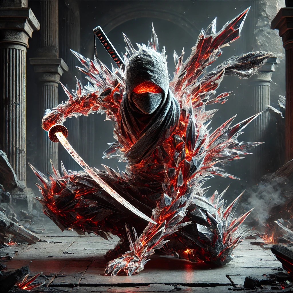 A crystal sculpture of a ninja, sculpted in a stealthy crouch, infused with the element of destruction, positioned within the shattered remains of a war-torn temple. The ninja’s jagged, fractured crystal form glows from within with fiery red energy and emits trails of dark smoke through deep cracks. He holds a shattered kunai with molten edges, ready to strike.