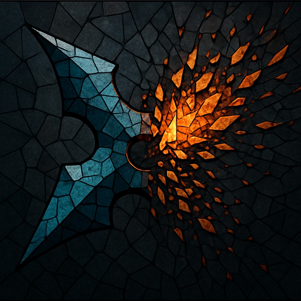 This image is a digital abstract mosaic shaped like a shuriken (throwing star), combining geometric fragmentation with a powerful destruction motif. The left half of the shuriken is composed of cool blue and gray shards, arranged in a precise, angular pattern typical of mosaic art. The right half explodes outward in a dramatic burst of fiery orange and red fragments, simulating a detonation or energy release.
