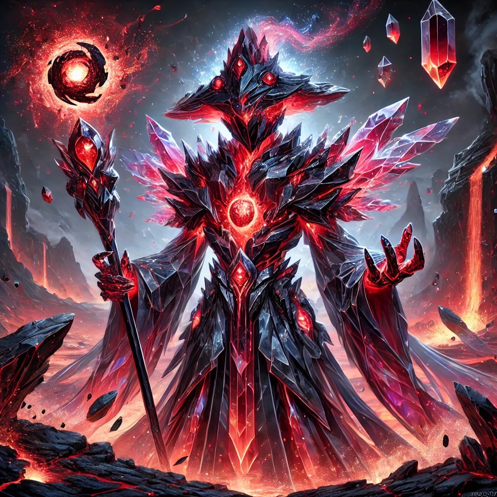 A towering, mystical crystal wizard, shaped from dark crimson and obsidian-like translucent crystal, radiating the pure essence of the Destruction Element. Jagged, flowing crystal robes drape from its angular frame, shimmering with fiery cracks and glowing molten veins that pulse like rivers of magma through its body. Its eyes blaze with intense red energy, burning like miniature suns.