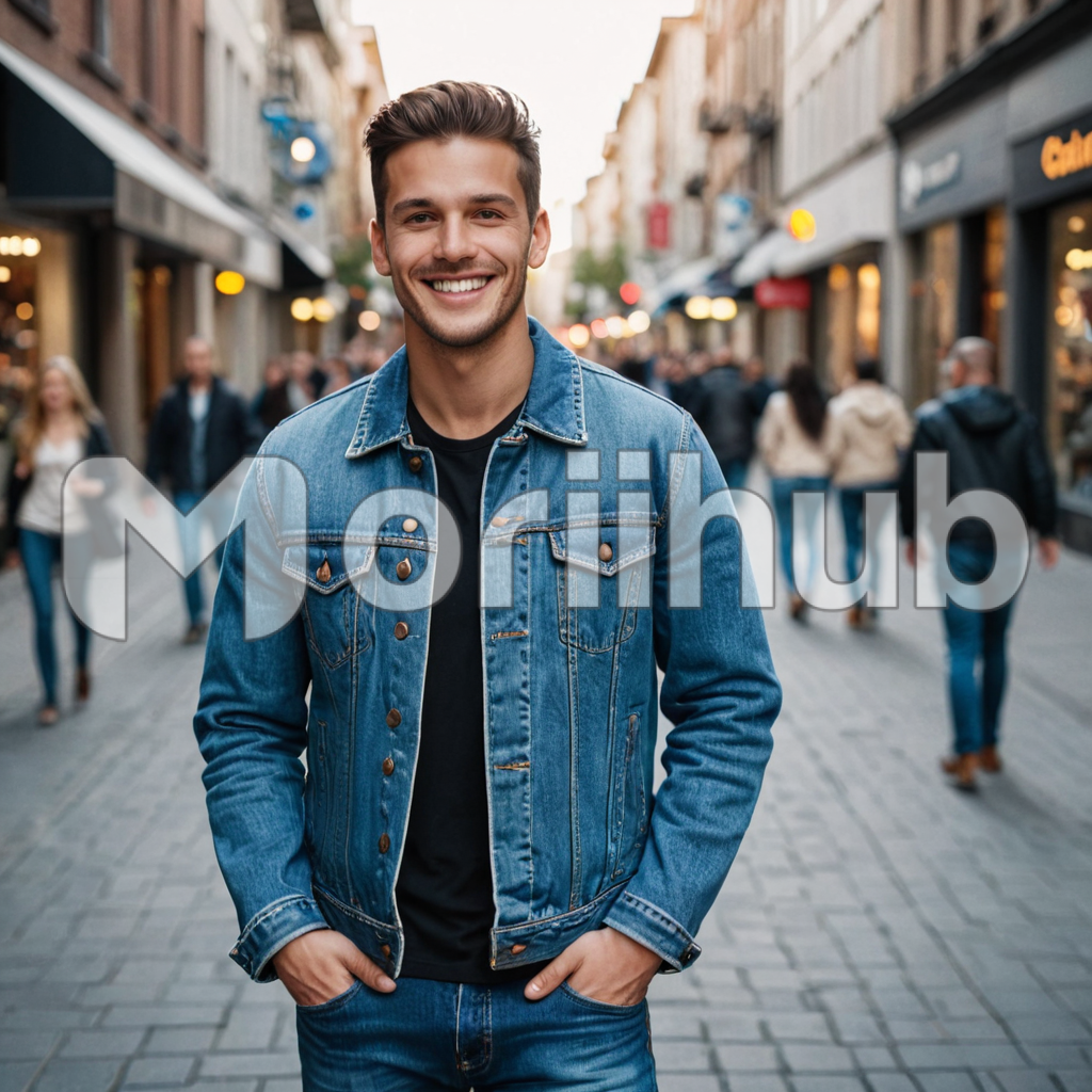 A man stands on a bustling street, donning a classic jean jacket with a cheerful smile. His hands are casually tucked into his pockets, exuding a relaxed demeanor amidst the urban hustle. Behind him, the scene is alive with activity as people go about their busy day, blurred in motion, suggesting a stark contrast to his calm presence. His attire is casual, complemented by a simple t-shirt underneath his jacket, making him blend seamlessly into the everyday scene, yet standing out with his bright, engaging smile.