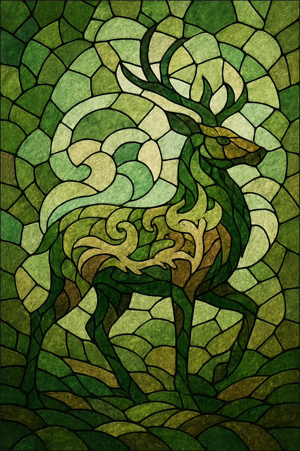 This artwork features a digital abstract mosaic in the shape of a deer, infused with the earth element theme. The image is rendered in a stained-glass style, composed of intricate, organic-shaped tiles in earthy tones such as greens, browns, and soft beiges. The deer stands in a majestic pose with its head raised and antlers spread wide, symbolizing grace and nature’s spirit.