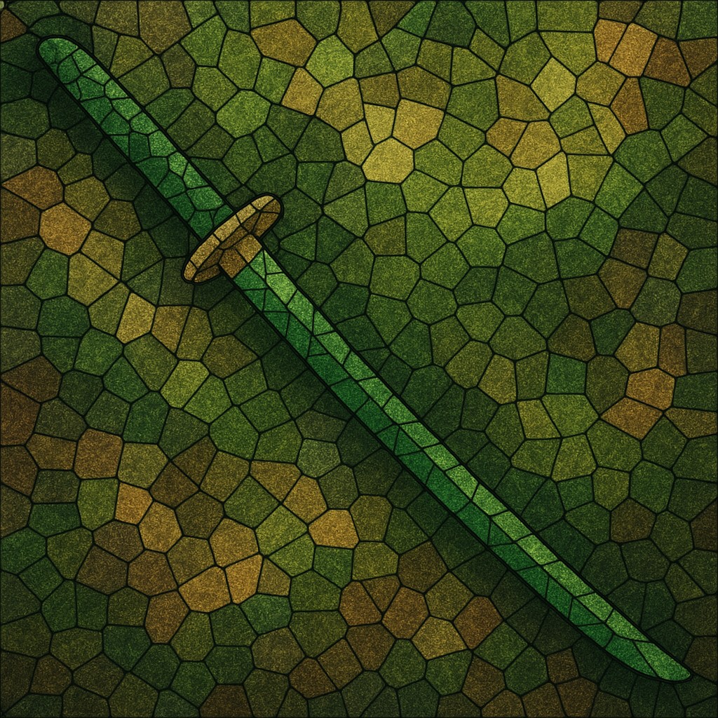 This image features a digital abstract mosaic of a katana sword that visually embodies the earth element. The katana is crafted from tessellated shapes in rich, earthy tones—primarily greens, browns, and golden yellows—suggesting a natural, grounded energy. The blade runs diagonally across the canvas, standing out with its gradient of forest and jade greens, while the hilt incorporates warmer, soil-toned hues.