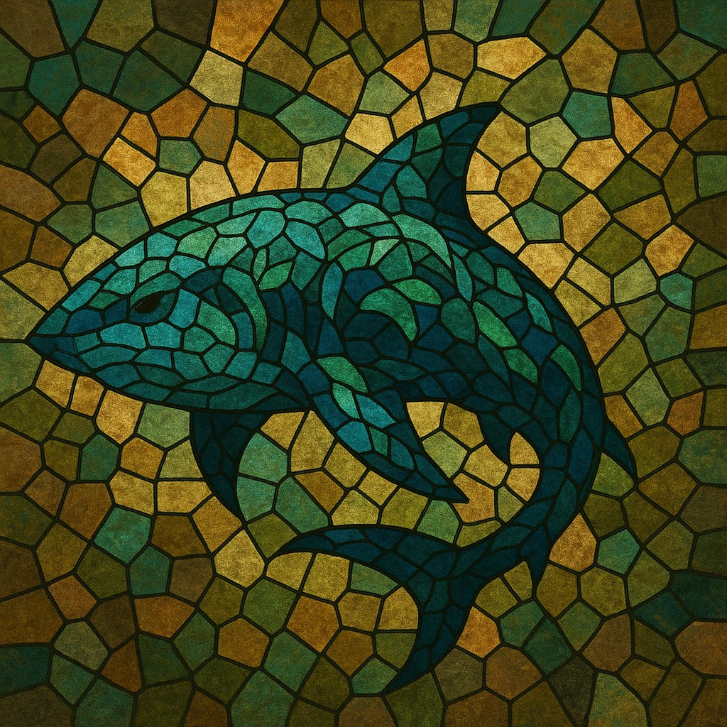 The image is a digital abstract mosaic artwork featuring a shark. The shark is crafted entirely from polygonal tiles in shades of deep blue, teal, and green, symbolizing a connection with the Earth element. These earthy hues are harmoniously contrasted with a natural-toned background consisting of warm ochres, browns, and muted greens.