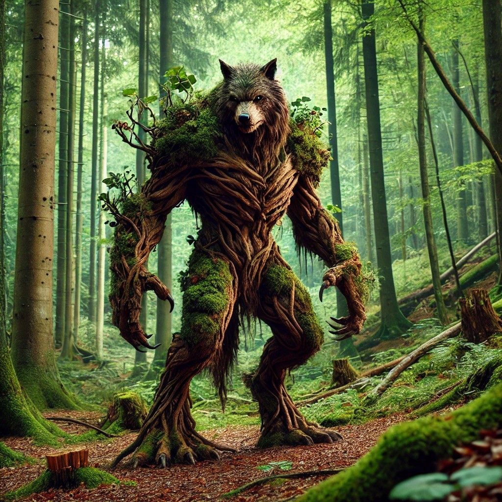 The image portrays a formidable earth werewolf standing tall within a lush, dense forest. This creature has a broad, muscular build with fur that appears as though it’s made from layers of soil, bark, and intertwined roots. Patches of moss and small green plants grow naturally across its shoulders and arms, blending it seamlessly with its surroundings. The werewolf’s eyes glow a deep, forest green, reflecting a connection to the ancient woods around it.