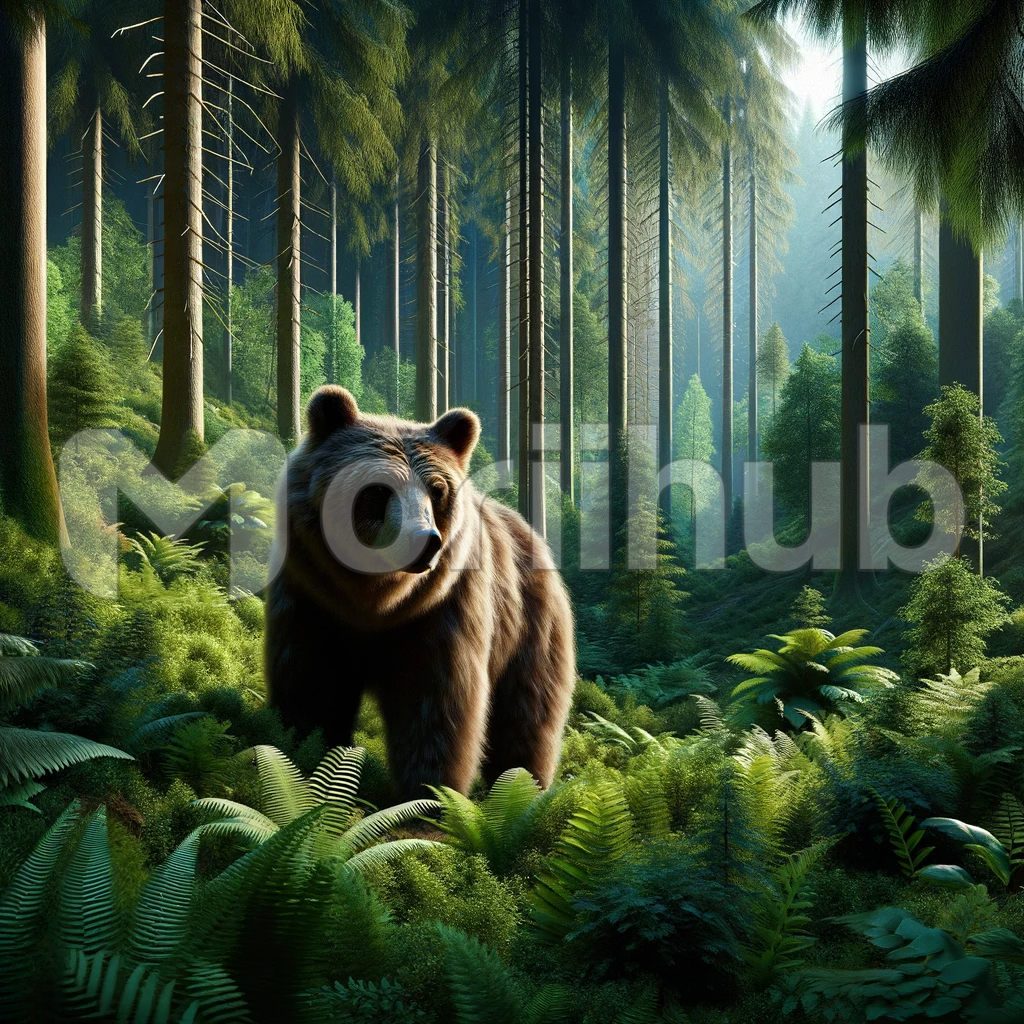 In this captivating image, a bear stands majestically amidst the heart of a dense forest, enveloped by a lush tapestry of vibrant greenery. Towering trees create a cathedral-like canopy overhead, while a variety of shrubs and ferns carpet the forest floor. The bear’s presence is a testament to the untamed beauty of the wilderness, where nature reigns supreme, and the intricate ecosystem thrives in harmonious splendor.