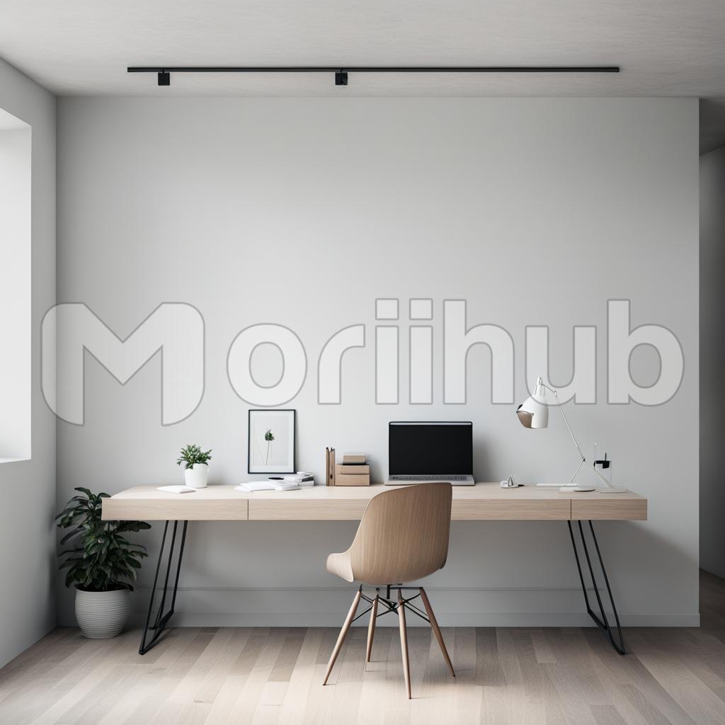 A sleek and minimalist workspace exudes simplicity and focus. A desk, flush against the wall, features only essentials: a modern laptop, a lone photo frame, and a petite flower pot. Serenity blooms with a larger pot on the floor beside the desk. The uncluttered atmosphere promotes concentration, while a solitary chair complements the clean aesthetic. The balance of technology and nature creates a tranquil oasis for productivity and inspiration in this thoughtfully curated space.