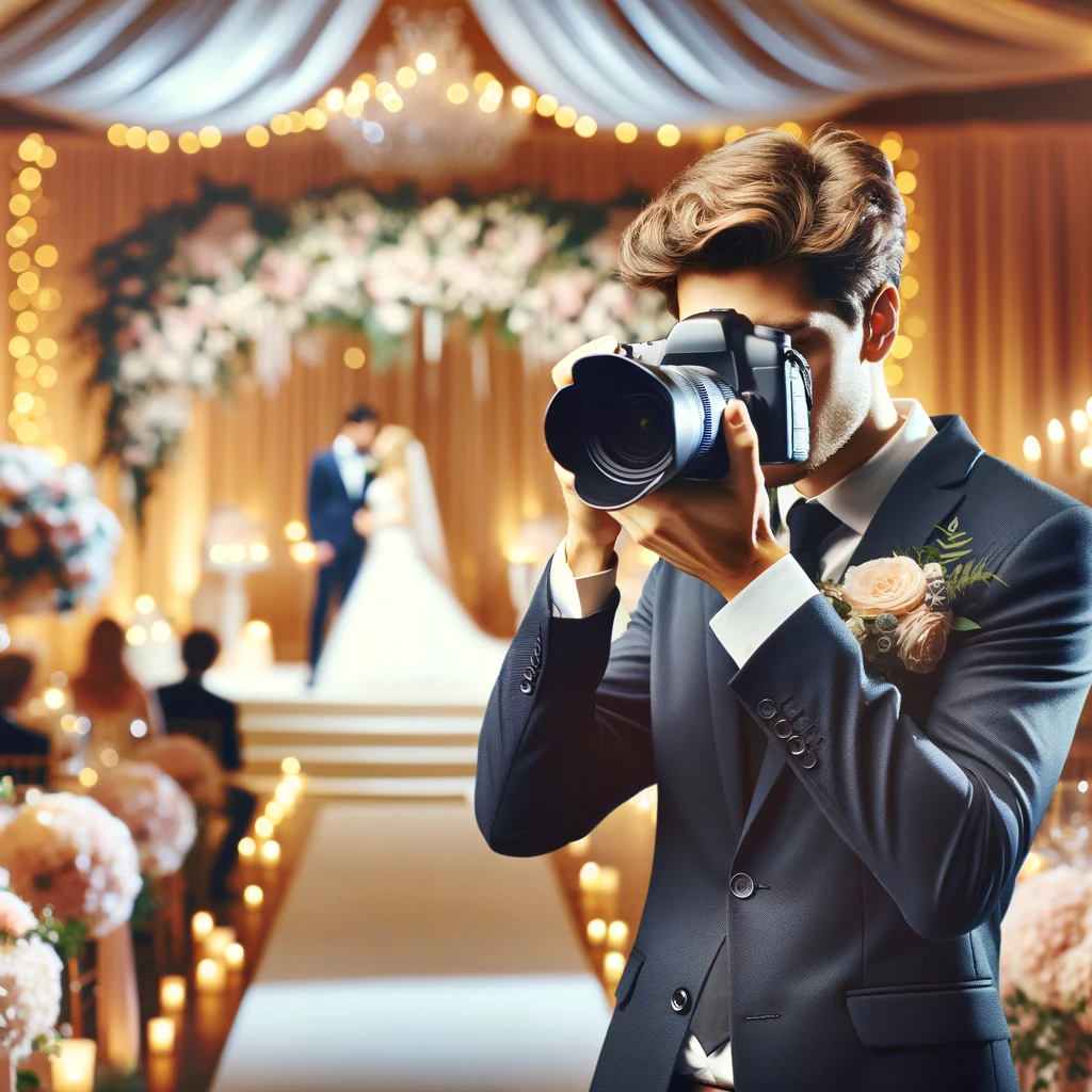 Amidst the elegance of a wedding celebration, a professional photographer, impeccably dressed, stands with focused determination. With precision and artistry, they capture fleeting moments of love and joy, their lens a conduit for immortalizing cherished memories on this special day of union and happiness.